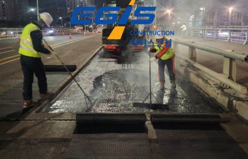 그 위에 방수층 보호재인 그리드를 설치함으로써 방수층과 포장층 사이의 결합력을 극대화하는 복합 공법입니다.